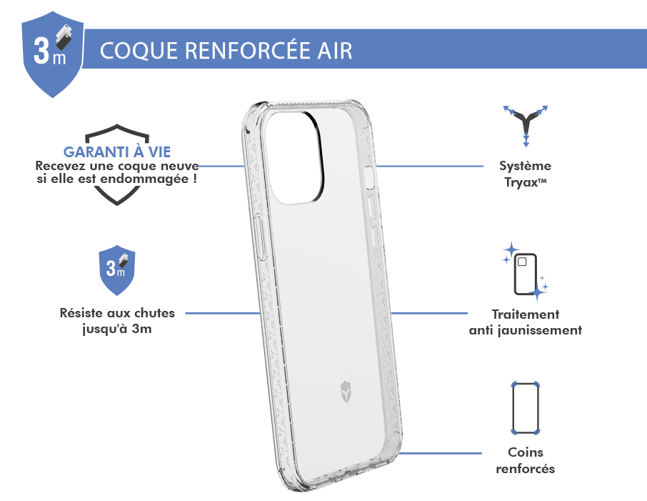 Les coins de la coque renforcés de cavités d'air sont capables d'amortir l'impact sans endommager le mobile.