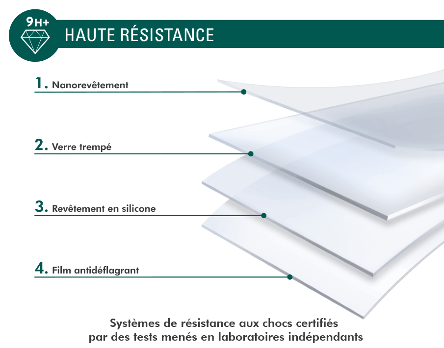 Traitement oléophobique anti-traces de doigts et conception anti-explosion qui évite les fragments dangereux et permet de le retirer facilement.
