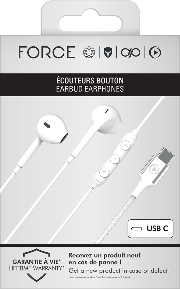 Ecouteurs USB C Télécommande/Micro Bouton + Garantie à vie + Guide d'utilisation/Sécurité/Garantie