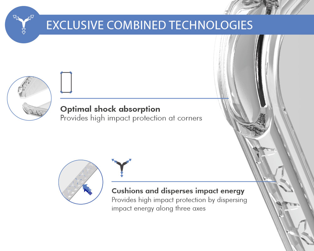 Ce système présent sur le contour de la coque est conçu pour absorber les impacts et disperser l'énergie du choc selon trois axes. Votre mobile est ainsi protégé de tous les côtés.