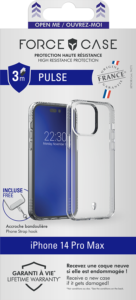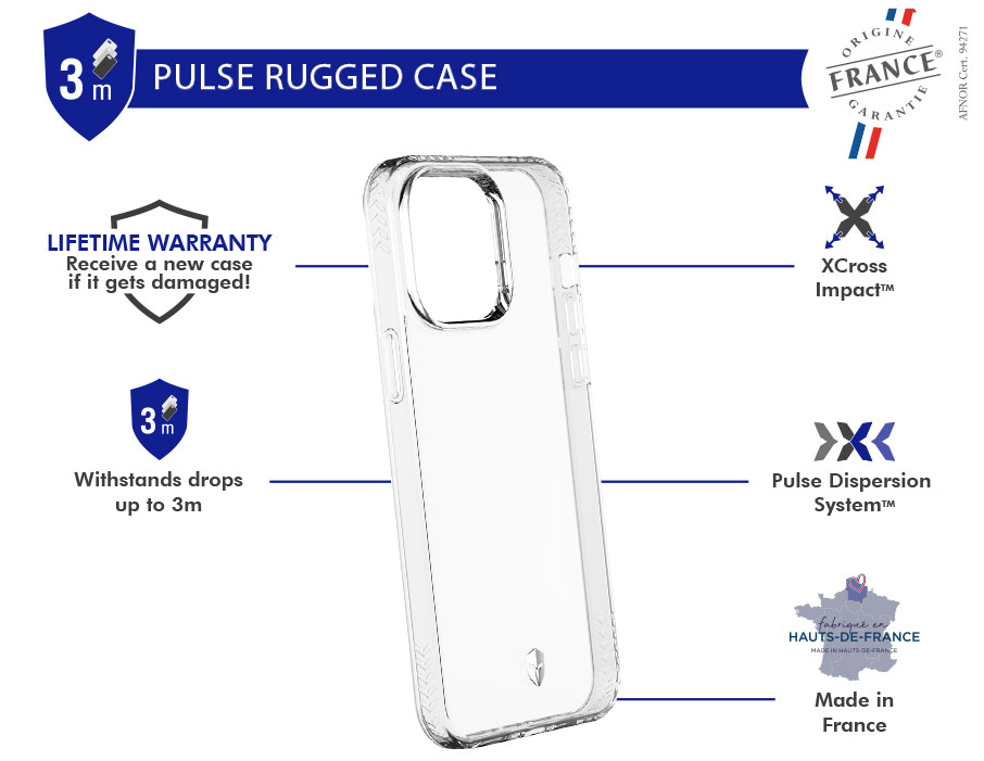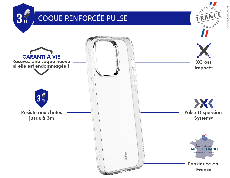 Coque renforcée PULSE Origine France Garantie 3m + Accroche bandoulière universelle + Garantie à vie