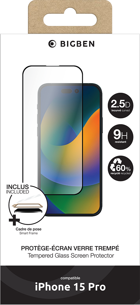Protège écran + SmartFrame™ 2.5D Verre trempé + Kit de nettoyage + Adhésif antistatique + Kit de pose intégré