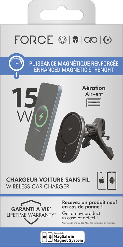 Chargeur sans fil voiture Magnétique MagSafe 15W Qi Support Ventilation + Câble de charge USB A/C + Garantie à vie + Guide d'utilisation/Sécurité/Garantie