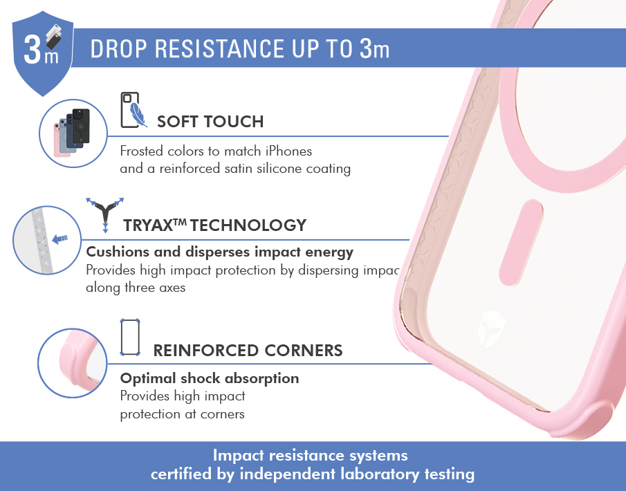 Les coins de la coque renforcés de cavités d'air sont capables d'amortir l'impact sans endommager le mobile.