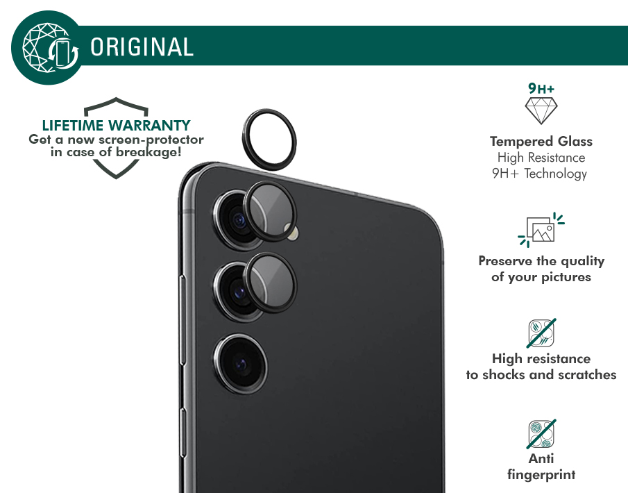 Protège lentilles x3 Verre trempé + Kit de nettoyage + Adhésif antistatique + Kit de pose biodégradable exclusif dédié + Garantie à vie