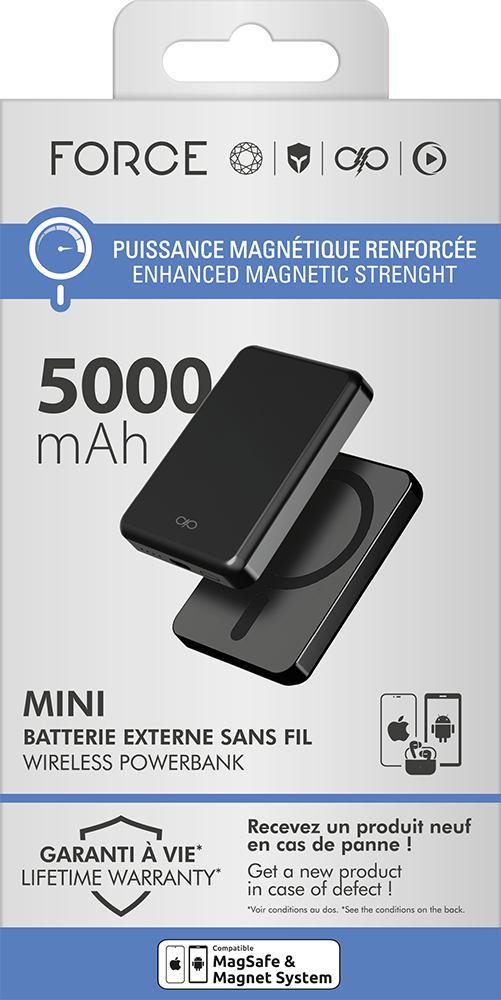 Powerbank sans fil Magnétique MagSafe 5000mAh + Câble USB C / USB C + Garantie à vie + Guide d'utilisation/Sécurité/Garantie