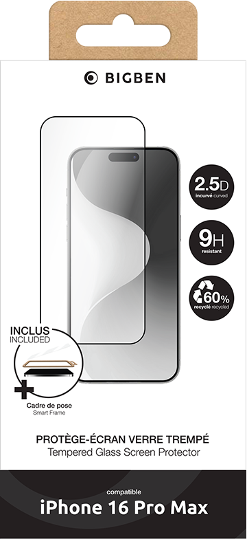 Protège écran + SmartFrame™ 2.5D Verre trempé + Kit de nettoyage + Adhésif antistatique + Kit de pose intégré