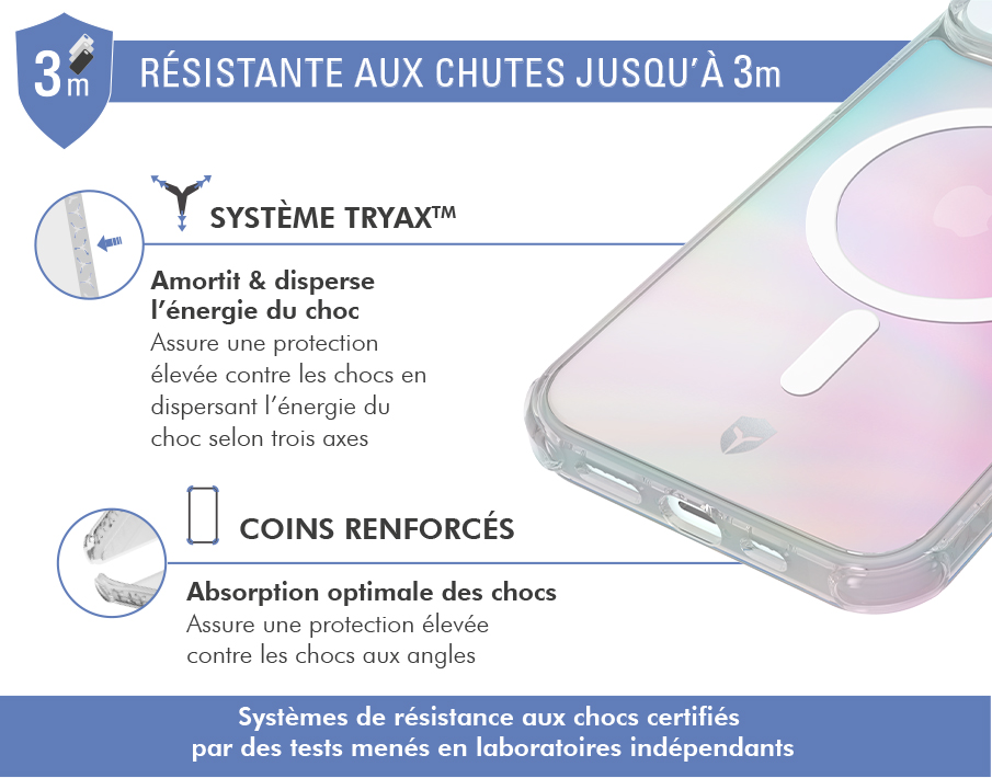 This system present on the outline of the case is designed to absorb impacts and disperse the energy of the impact along three axes. Your mobile is thus protected on all sides.