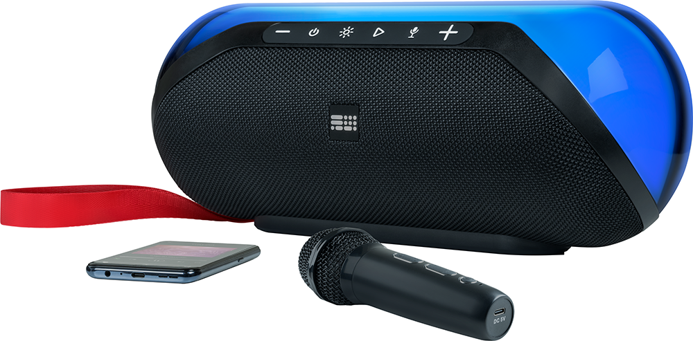 Enceinte Karaoké Bluetooth® 50W Lumineuse avec 1 micro filaire + Sangle de transport + Guide d'utilisation/Sécurité/Garantie