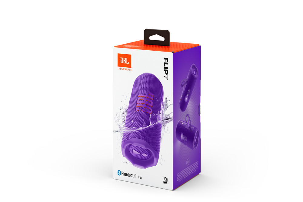L'enceinte JBL Flip 7 contient 77 % de plastiques recyclés et 100 % de tissus recyclés post-consommation pour la grille d'enceinte. Elle est également emballée dans du papier certifié FSC, imprimé à l'encre de soja.