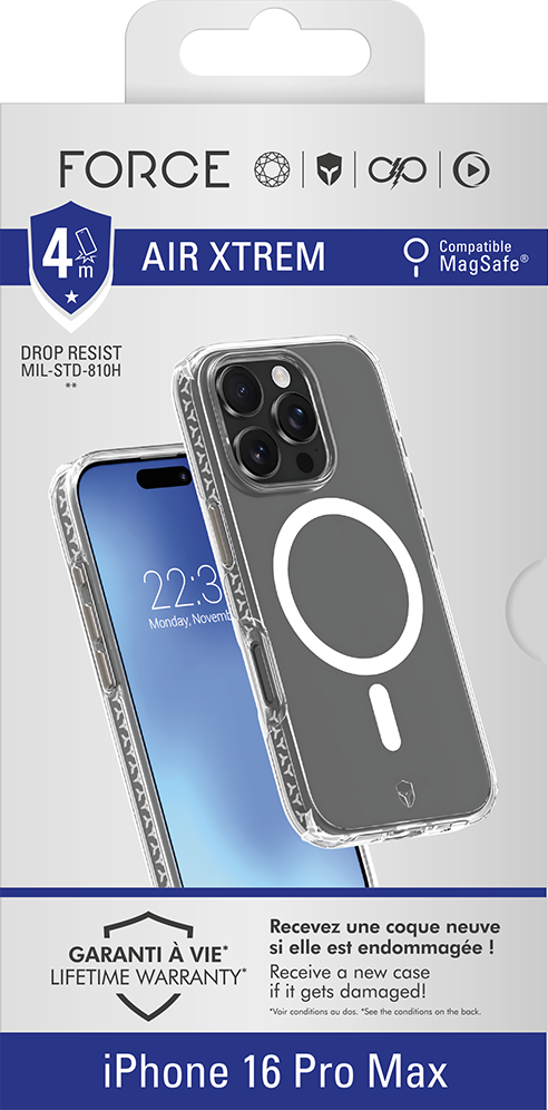 Accueil / Accessoires / Protection / Coques renforcées / Coque renforcée MagSafe iPhone 16 Pro Max AIR XTREM 4m Norme Militaire MIL-STD 810G Transparente + Garantie à vie