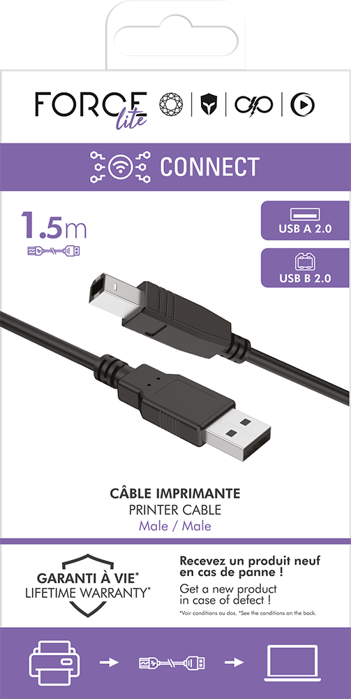 • Contenu du pack : Câble Imprimante USB A 2.0 / USB B 1.5m mâle/mâle + Garantie à vie + Guide d'utilisation/Sécurité/Garantie