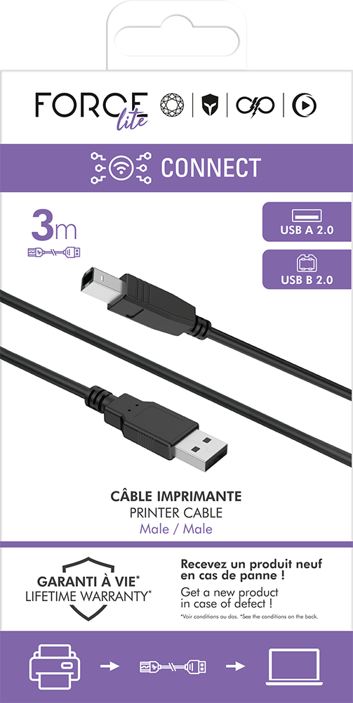 Câble Imprimante USB A 2.0 / USB B 3m mâle/mâle + Garantie à vie + Guide d'utilisation/Sécurité/Garantie