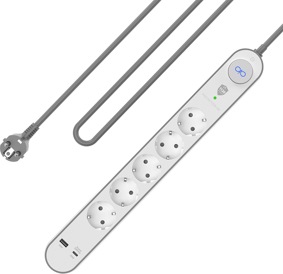 Plus besoin de chargeurs supplémentaires, ils sont directement intégrés dans la multiprise. Branchez simplement vos câbles pour recharger rapidement smartphone, tablette ou tout autre appareil mobile. Chargeur 20W Power Delivery 70 % plus rapide qu'un chargeur classique** pour vos appareils en USB C et Chargeur 3A (18W) pour vos périphériques en USB A.