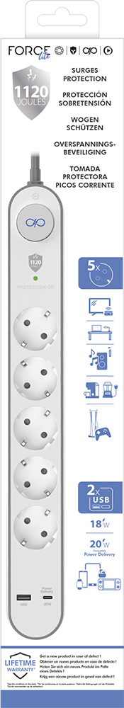Parafoudre 5 prises GSchuko Type F 1120J + 2 ports USB A+C PD 1.5m + Garantie à vie + Guide d'utilisation/Sécurité/Garantie