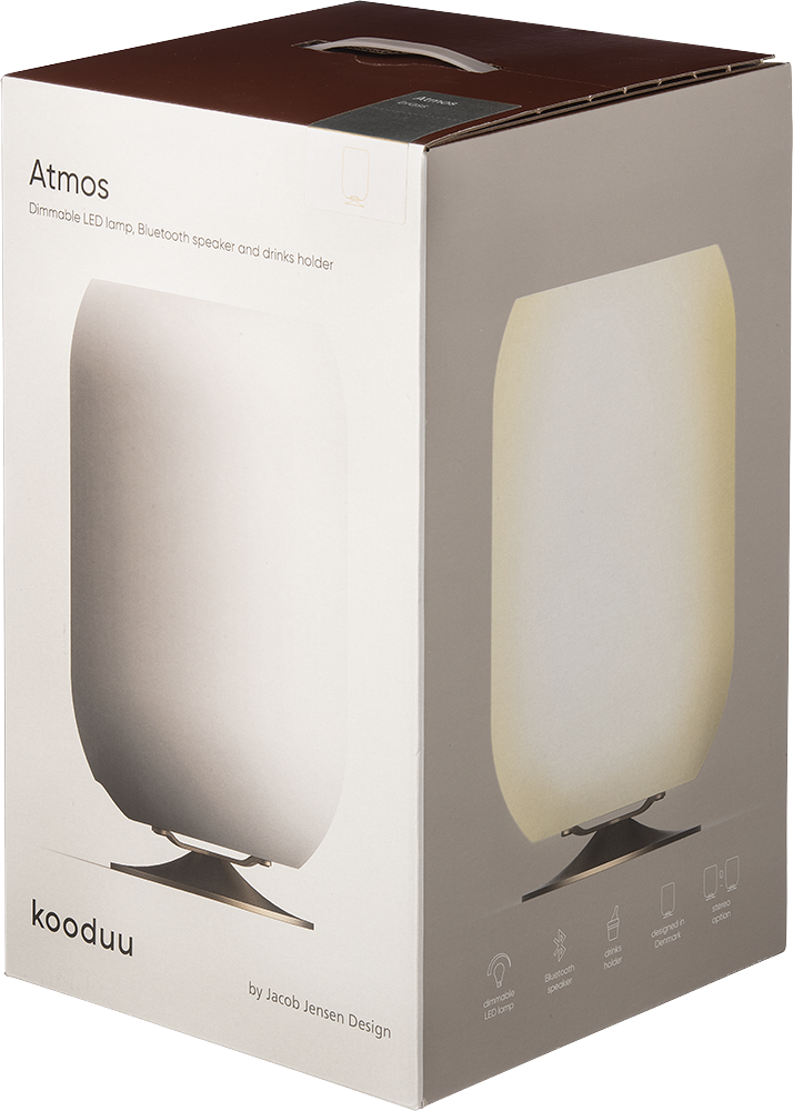 Délicatement posé sur un socle en acier coloris argent brossé Atmos mise sur la pureté des formes pour l'esthétique ; mais derrière cette apparente simplicité se cache un produit polyvalent et high-tech : il combine une enceinte Bluetooth pour diffuser vos playlists musicales, depuis n'importe quel appareil Bluetooth (Ordinateur, tablette, smartphone), une lampe LED pour créer une ambiance lumineuse chaude, et une cavité sur le dessus pouvant être utilisée en seau à champagne pour garder jusqu'à 2 bouteilles au frais.