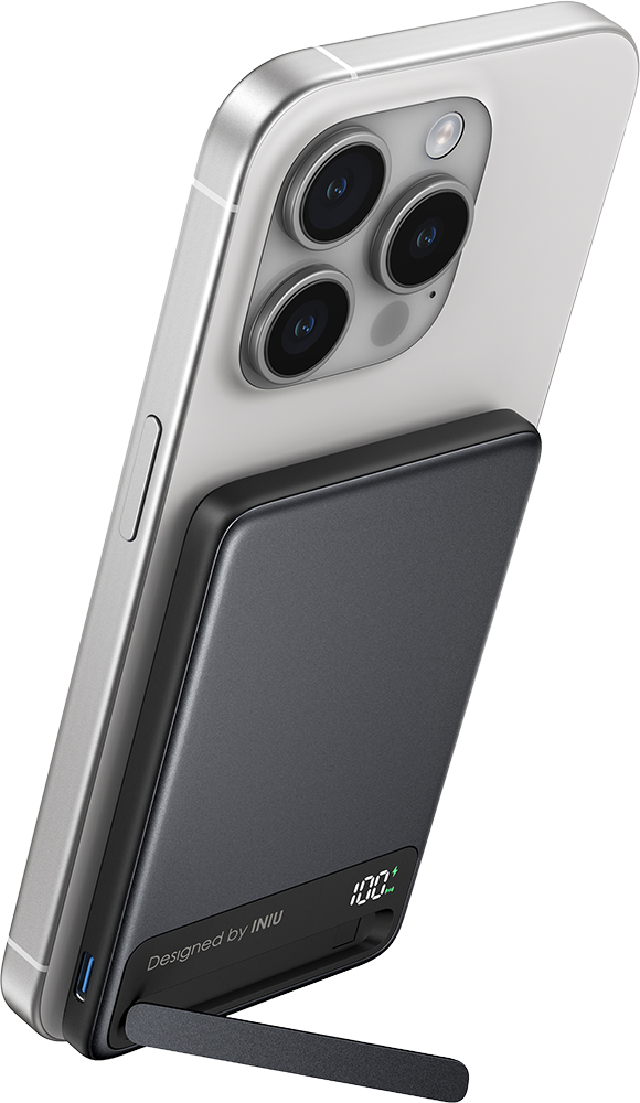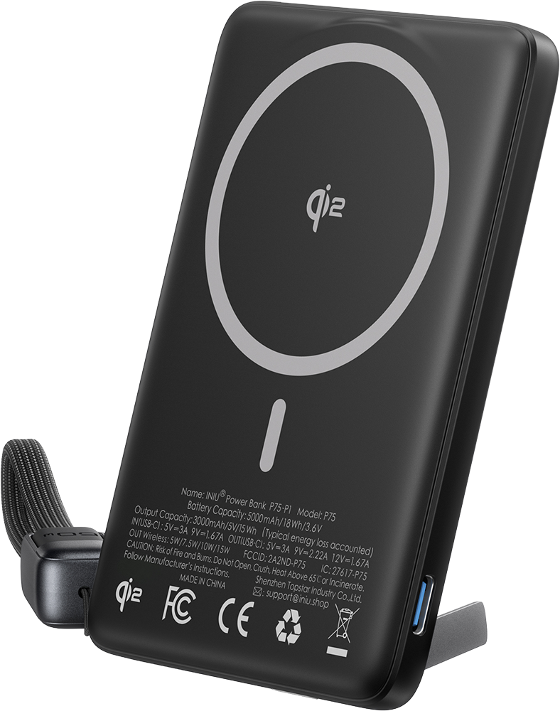 Capacité de batterie : 5000mAh - Charge Filaire 20W PD/QC - Charge sans fil 15W Qi - Stand + Câble attaché