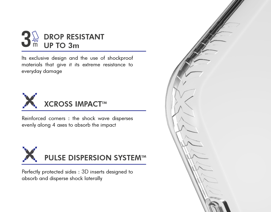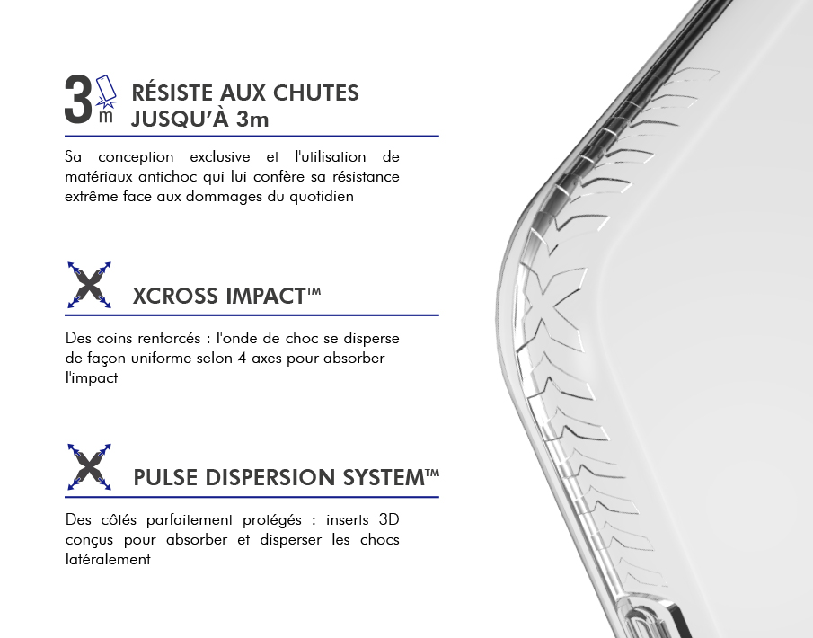 Coins renforcés grâce à une diffusion uniforme de l'onde de choc selon 4 axes. Votre mobile est ainsi parfaitement protégé en cas de chute.