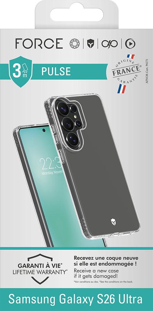 Accueil / Accessoires / Protection / Coques renforcées / Coque renforcée Samsung Galaxy S26 Ultra PULSE Origine France Garantie 3m Transparente + Garantie à vie - Origine France Garantie