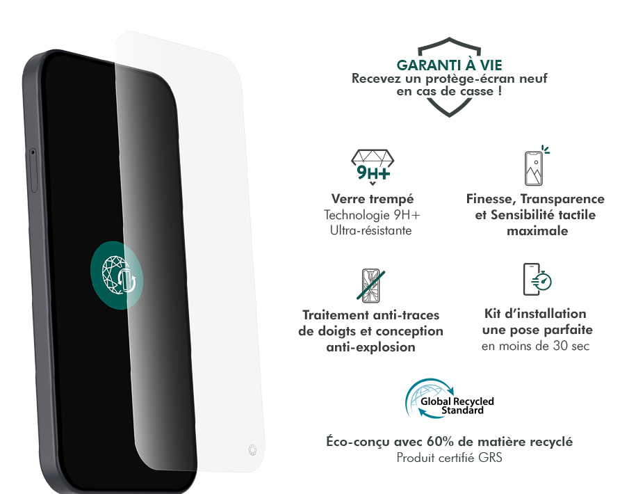Kit de pose exclusif dédié pour chaque mobile pour une installation simple, rapide et sans bulle.