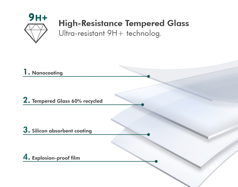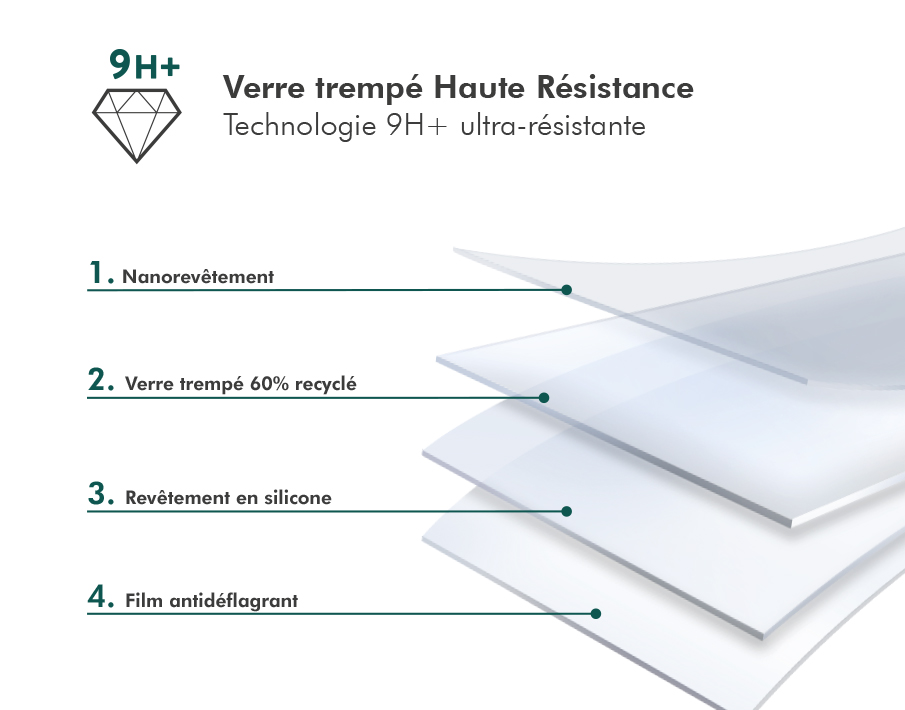Traitement oléophobique anti-traces de doigts et conception anti-explosion qui évite les fragments dangereux et permet de le retirer facilement.