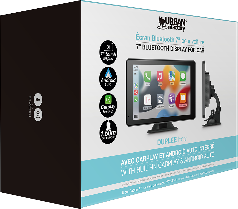 • Contenu du pack : Ecran multimédia de voiture 7'' Carplay/Android Auto + Ventouse pour pare-brise et support autocollant pour tableau de bord + Alimentation USB-C avec adaptateur allume-cigare USB-C + Guide d'utilisa