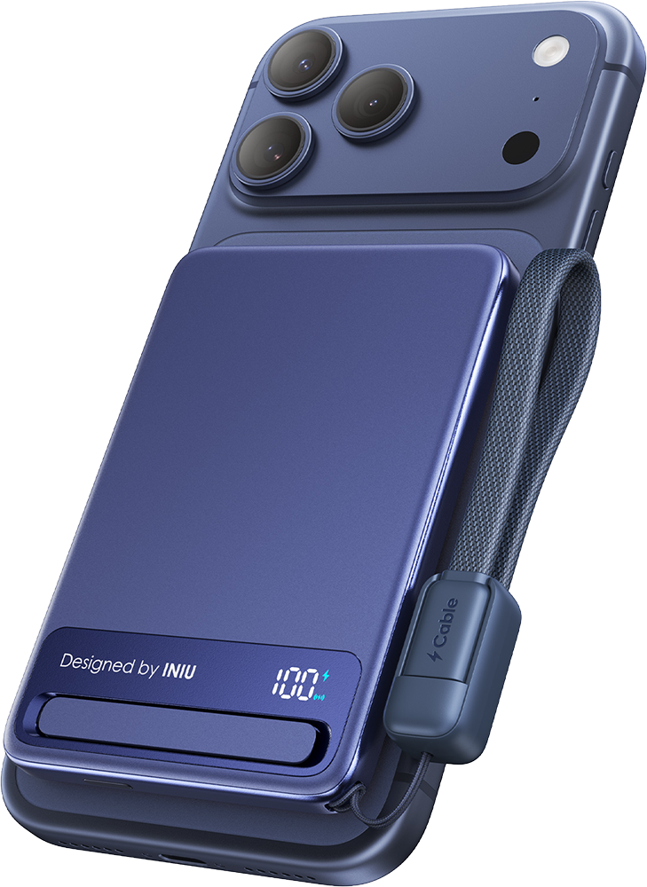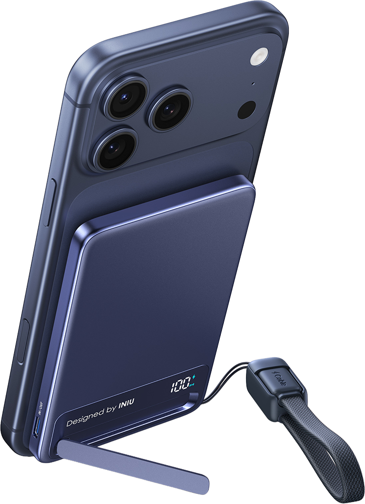 Capacité de batterie : 5000mAh - Charge Filaire 20W PD/QC - Charge sans fil 15W Qi - Stand + Câble attaché
