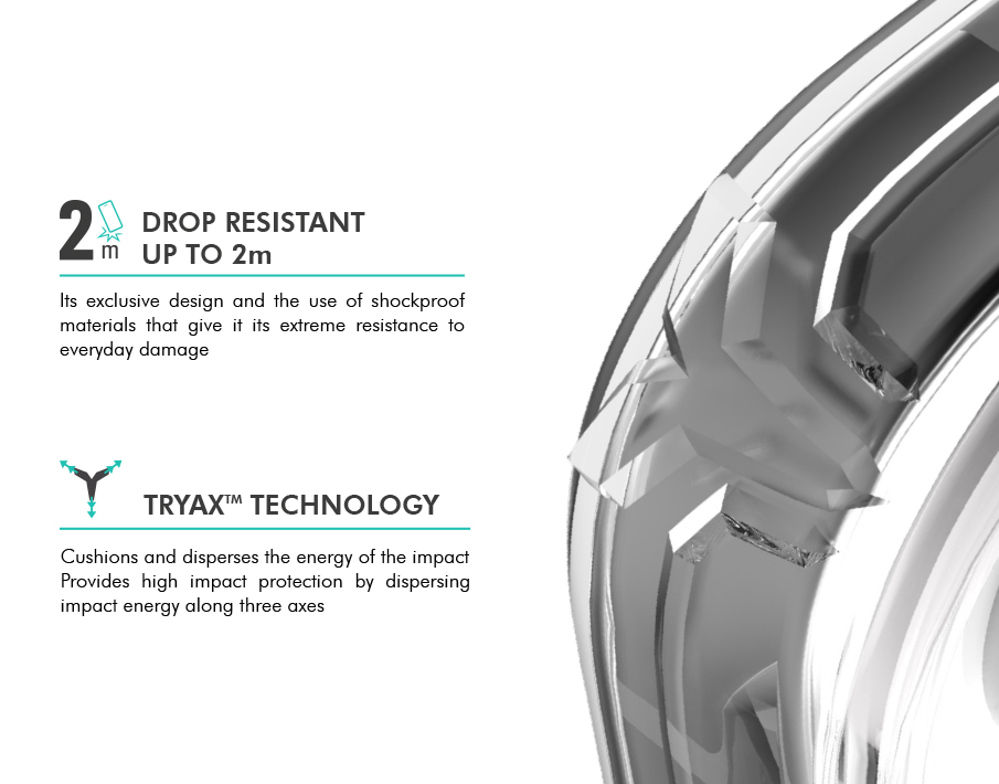 Sa conception exclusive et l'utilisation de matériaux antichoc qui lui confère sa résistance extrême face aux dommages du quotidien.