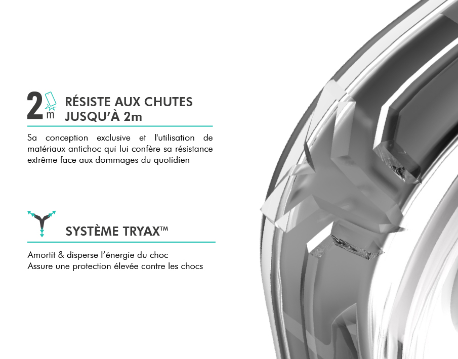 Ce système présent sur les coins de la coque conçus pour absorber les impacts et disperser l'énergie du choc selon trois axes. Votre mobile est ainsi parfaitement protégé en cas de chute